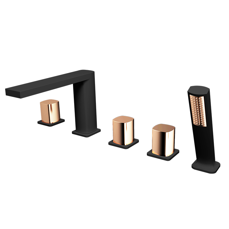 When it comes to creating a luxurious and modern bathroom space, the **Hot sale luxury hotel brass five hole fashion black gold bathroom faucet** stands out as the ultimate choice. This exquisite fixture effortlessly blends style, functionality, and durability, redefining what it means to have upscale bathroom décor. Whether you are searching for a centerpiece to elevate your bathroom’s aesthetic or a reliable fixture built to last, this faucet checks all the boxes.Crafted with elegance in mind, the faucet features a striking combination of **matte black** and **rose gold accents**. This harmonious blend offers a sense of bold sophistication, making it a top contender for anyone who values fashionable bathroom fixtures. The matte black finish exudes a modern, understated charm, while the rose gold detailing adds warmth and opulence. It’s not just a faucet—it’s a sculptural work of art designed to elevate any space, from home bathrooms to top-tier luxury hotels. With a clean and geometric design, this faucet is the ideal choice for enthusiasts of **modern bathroom faucets** who crave both style and functionality.One of the defining features of this fixture is its emphasis on functionality. As a **five-hole faucet**, it seamlessly integrates multiple components, including sculpturally designed handles and a sleek handshower, offering users maximum convenience and flexibility. The deck-mount installation makes it a versatile option, whether for a spacious bathtub or a fashionable double sink setup. The **brass bathroom faucet** construction ensures reliability and longevity, as it is engineered to withstand daily use without diminishing its aesthetic brilliance. Additionally, the eco-friendly water-saving technology incorporated in this faucet demonstrates that sustainability and luxury can coexist seamlessly.The handshower is one of the standout components of this faucet system. Designed to meet the highest standards of utility and beauty, the handheld shower comes with a grid-like array of nozzles to deliver high-pressure water flow. It is perfect for rinsing or enjoying a spa-like experience in the comfort of your home. This feature, paired with the ergonomically designed cylindrical handles, allows for effortless control over water flow and temperature. Whether you are unwinding after a long day or preparing a luxurious bath, the functionality and comfort of this faucet redefine personal indulgence in bathroom design.Apart from its practical features, the **Hot sale luxury hotel brass five hole fashion black gold bathroom faucet** is a versatile addition to various design schemes. Its bold black finish and warm rose gold accents pair effortlessly with marble countertops, ceramic sinks, or freestanding tubs. Whether your design preference leans toward avant-garde minimalism or timeless elegance, this faucet guarantees a perfect complement to your bathroom’s aesthetic. It’s no surprise that such **hotel quality faucets** have become a staple in luxury hotels and high-end residential projects alike.In conclusion, this faucet transforms any bathroom into a haven of elegance and sophistication. Its high-quality brass construction, innovative features, and versatile design make it a product that is not only functional but also a statement of style. For anyone looking to invest in **fashion bathroom fixtures** that blend utility with aesthetic appeal, the **Hot sale luxury hotel brass five hole fashion black gold bathroom faucet** is an unbeatable choice. Experience how modern luxury looks, feels, and functions with this exceptional faucet system—because your bathroom deserves nothing less than the best.