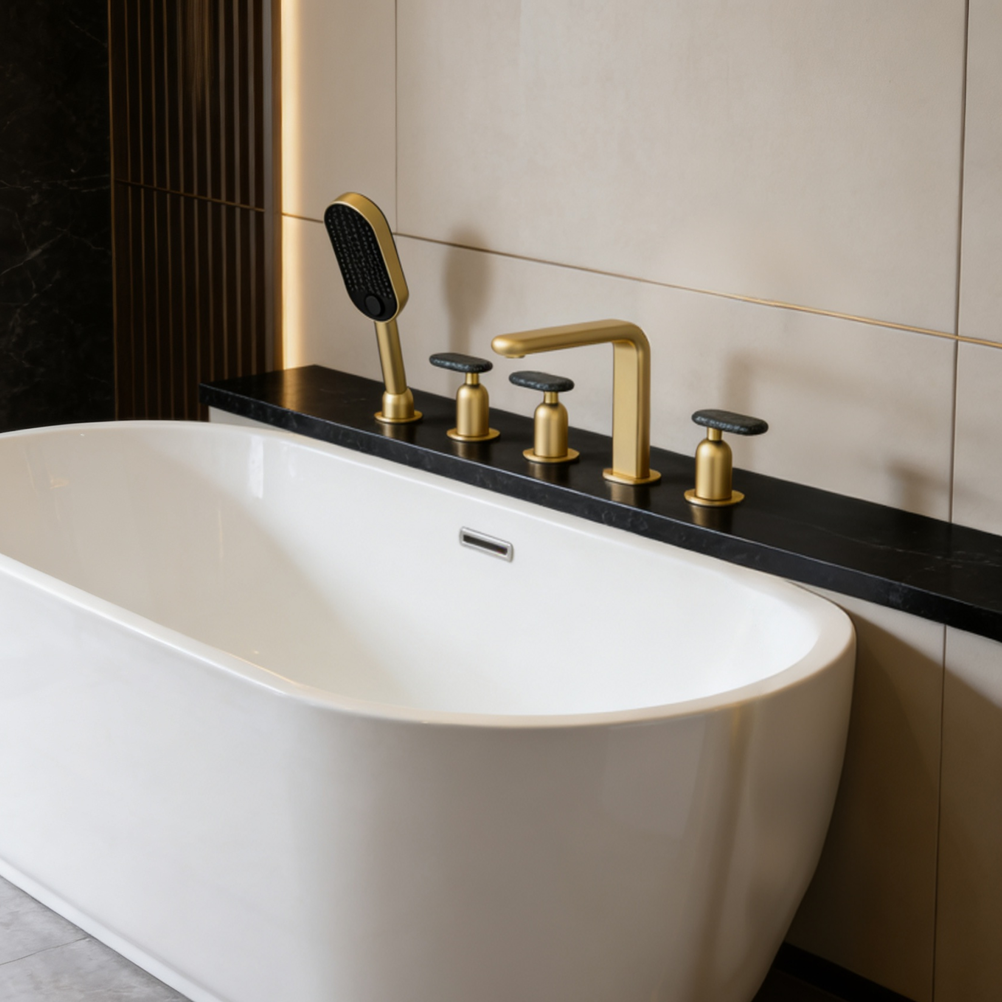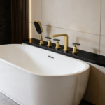 Elevate your bathroom’s allure with these luxury bathroom fixtures that prioritize both form and function. The waterfall faucet design creates a mesmerizing visual as water gently spills over, turning a simple bath into a ritual of indulgence. Paired with the solid brass construction, this setup promises longevity, resisting wear from daily use and maintaining its lustrous appearance over time. Whether you’re renovating or upgrading, incorporating a mounted tub filler like this one introduces an element of opulence that resonates with high-end design trends. The hand shower, with its adjustable spray patterns, adds practicality for quick showers, ensuring this fixture serves multiple purposes without sacrificing its elegant profile.
