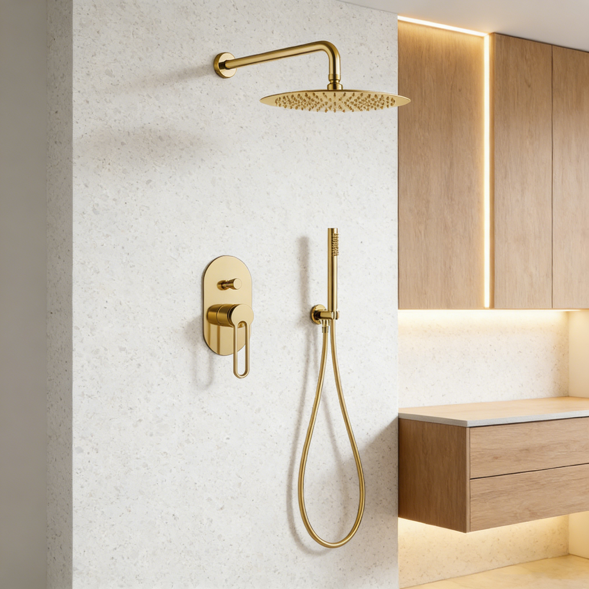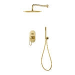 contemporary bathing solutions. At the heart of this set is the impressive Gold Rainfall Shower System, a shining beacon of modern