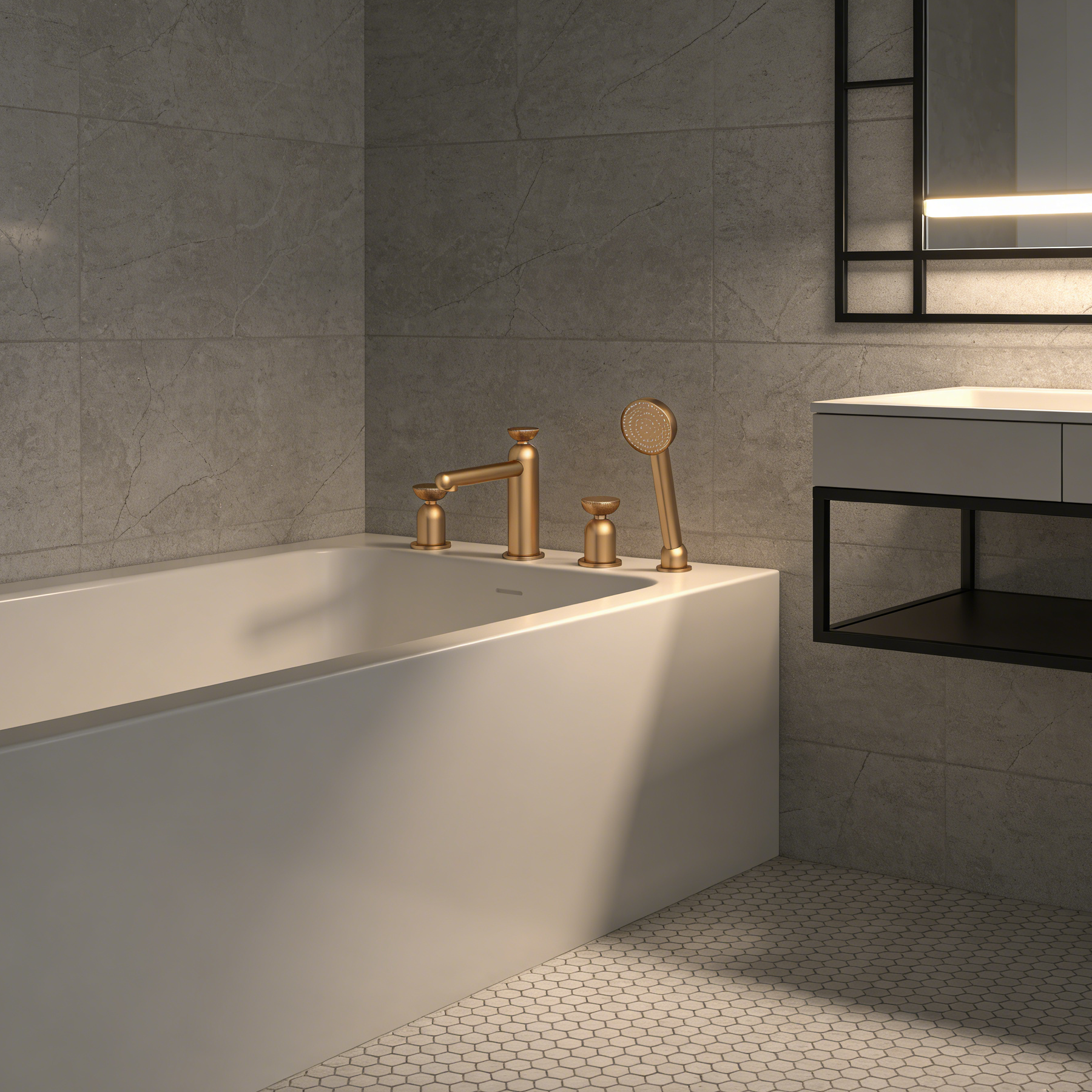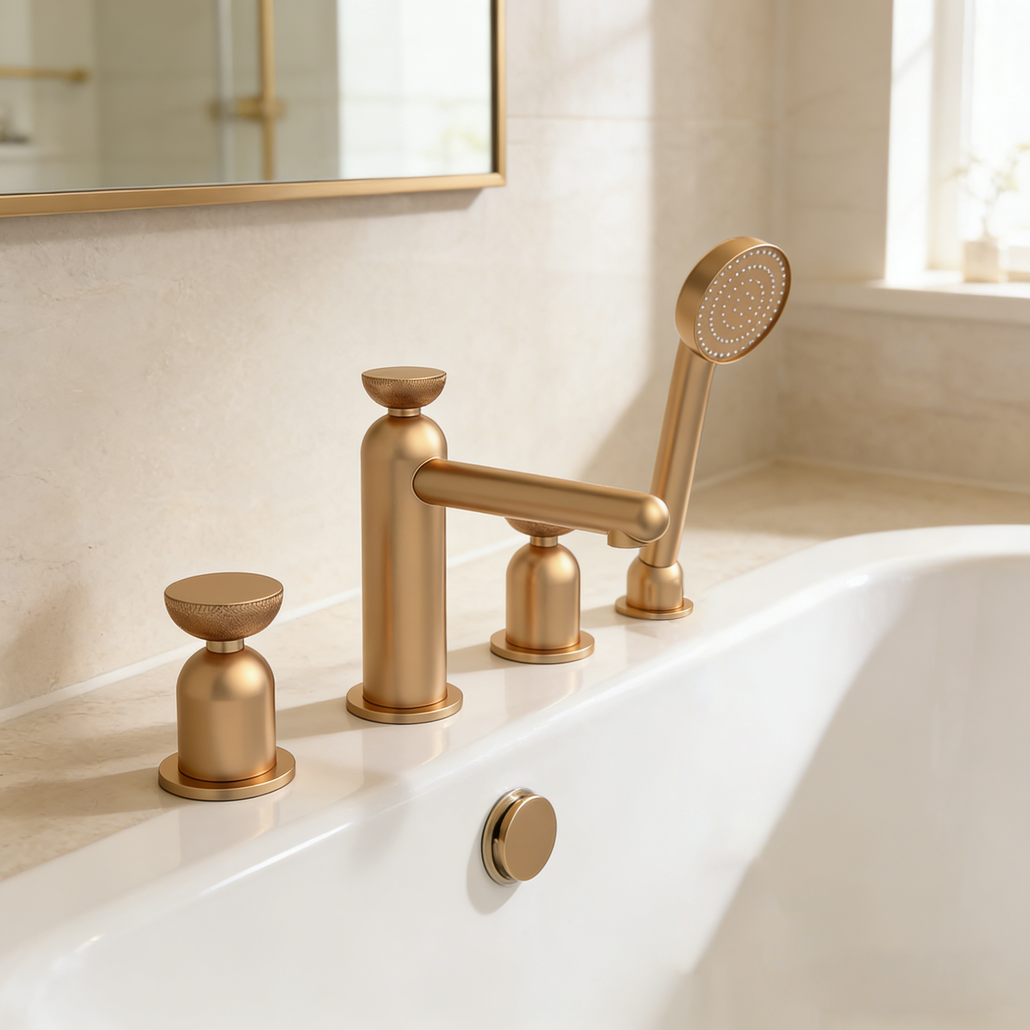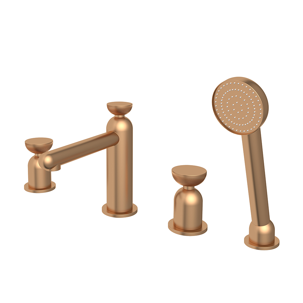 Delve deeper into the details of this five hole mixer tap, which includes precisely engineered components for optimal performance. The central mixer tap allows for precise temperature and pressure control, while the five-hole configuration accommodates a handheld showerhead, spout, and ergonomic handles for hot and cold water. Each element is forged from high-quality brass with a brushed gold finish that resists corrosion and tarnishes over time. Complementing this is the bathtub mixer set’s versatile design, perfect for both filling your tub quickly or enjoying a refreshing shower. The luxury bathtub faucet aspect shines through its sleek, contemporary lines that add an opulent touch to any bathroom decor, whether minimalist or ornate.
