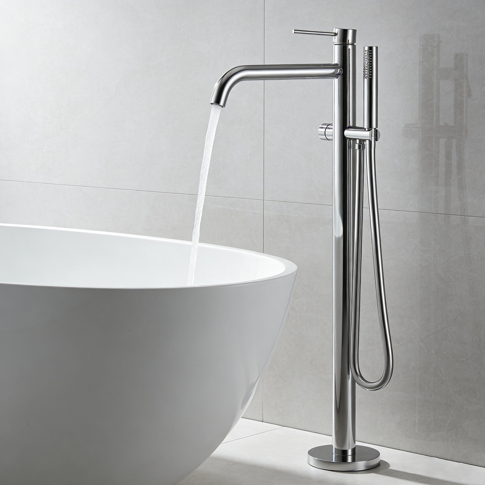 The floor mounted bathtub faucet boasts a robust construction from premium stainless steel, ensuring long-lasting durability against daily wear and tear. Its polished chrome finish not only resists corrosion but also adds a brilliant shine that elevates the aesthetic of any bathroom. The freestanding bath mixer tap design allows for flexible installation, positioning it perfectly beside your tub without compromising on space or visual appeal. With its smooth arc spout, water flows gently and continuously, providing a soothing cascade that enhances relaxation during your bath time. The included hand shower adds versatility, enabling you to switch effortlessly from an immersive soak to a refreshing rinse, all controlled with precision.
