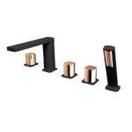 The first thing that captures your attention is the striking matte black finish of this luxury bathroom faucet. Paired with rose gold accents, this bold combination exudes timeless elegance, blending contemporary style with a touch of classic flair. The clean, minimalist lines of the design further enhance its modern aesthetic. Whether you have a spa-inspired retreat or a high-end designer bathroom, this faucet set will seamlessly complement and elevate the décor.This 5 hole deck mount faucet is not just a beauty to behold, but also a marvel of functionality. The rectangular spout stands out with its sleek appearance and optimal water flow, providing a practical yet stylish solution. The set includes two rose-gold cylindrical knobs, which work as dual controls for temperature and water pressure, offering precision and smooth operation at your fingertips. Adding further to its luxurious appeal is a diverter and mixer that flawlessly transitions water to the handheld shower head. This feature offers greater versatility and convenience, making it perfect for a quick rinse or a more thorough bathing experience.One of the standout elements of this brass bathtub faucet set is the handheld shower head, crafted with matching matte black and rose gold accents. Ergonomically designed for comfort, it boasts a perforated pattern for a perfectly even rinse. Ideal for relaxation and unwinding, the shower head is both functional and stylish. This comprehensive set ensures that every detail of your bathing experience is elevated, from start to finish.Craftsmanship is key to the enduring quality of this modern bathtub faucet. Made from high-grade brass, this set is highly resistant to corrosion, tarnishing, and wear, ensuring it maintains its stunning appearance for years to come. The materials and finishes have been carefully selected to withstand time and trends, so you can be confident in your investment. This attention to detail makes it a standout in the luxury bathroom market.More than just a utilitarian fixture, this designer bathroom sink faucet set enhances your daily rituals. It speaks to a lifestyle of elegance and sophistication, turning everyday moments into exceptional experiences. Whether it’s adjusting the control knobs for the perfect water temperature or enjoying the ergonomic comfort of the handheld shower head, this faucet set transforms an ordinary bathroom into a retreat of unparalleled luxury.In conclusion, the Luxury Bathroom Black Brass Material 5 Hole Deck Mount Brass Bathtub Faucet Set is a signature piece for modern living. Combining bold aesthetics with premium functionality, it offers more than just a practical purpose — it delivers an experience. By choosing this outstanding product, you’re not simply upgrading your bathroom fixtures; you’re investing in elegance, innovation, and enduring quality. This is your chance to make a bold statement and redefine your bathroom as a personal haven of style and comfort.