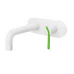If you’re on the lookout for a fixture that combines cutting-edge design with eco-conscious functionality, the **Wall-Mounted White Stylish Bathroom Basin Faucet** should be at the top of your list. As a statement piece that embraces both style and practicality, this contemporary faucet offers the perfect blend of minimalism and innovation, ideal for modern interiors.The faucet is an embodiment of elegance, thanks to its crisp matte white finish that adds a sense of pristine sophistication to any bathroom or kitchen. Its sleek, wall-mounted design immediately elevates the surrounding space, making it a centerpiece of contemporary decor. The clean, rounded edges seamlessly integrate with the accompanying wall plate, showcasing architectural harmony where form meets utility. For added flair, the elongated ergonomic handle features a refined green accent, symbolizing tranquility and sustainability. This splash of color contributes not just to visual interest but to the faucet’s environmentally-conscious messaging, making it a thoughtful choice for today’s eco-aware homeowner.