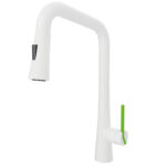 Upgrade your kitchen’s style and functionality with the **White Modern Pull-Down Kitchen Faucet**, a stunning blend of aesthetics and practicality. This faucet perfectly complements modern kitchens with its pristine matte white finish, elevating everything from Scandinavian-inspired spaces to ultra-modern designs. Its unique combination of design and advanced performance makes it a standout fixture that promises to enhance your day-to-day kitchen experience.What truly sets this **white pull-down faucet** apart is its innovative design. Featuring an eye-catching green lever handle, it combines a minimalist look with a bold touch of color. This vibrant green detail adds a refreshing pop to your kitchen’s décor, effortlessly blending function with flair. Beyond its visual appeal, the ergonomic pull-down spray head elevates its usability. Whether you’re rinsing vegetables, filling a stockpot, or tackling hard-to-reach spots in your sink, the spray head transforms these tasks into effortless routines.